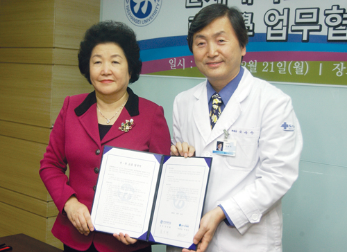 ÇѼ¼´ëÇб³(±è¼ºÇý ÃÑÀå)¿Í ¾È¾ç »ùº´¿ø(¹Ú»óÀº ÀÇ·á¿øÀå)ÀÌ 21ÀÏ ¿ÀÀü »ùº´¿ø º»°ü 5Ãþ È£¶ó¸¶ Ȧ¿¡¼ »êÇÐ ±³·ùÇù¾à½ÄÀ» °¡Á³´Ù. À̹ø ±³·ùÇù¾àÀ¸·Î ¾ç ±â°üÀº ¿¬±¸¿Í ±³À°ÀÇ Çâ.... ¤ÓÀ̼ÒÈç ±âÀÚ 2009-12-25