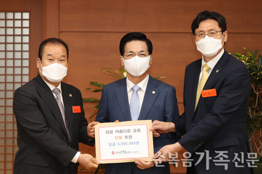 ¾È¼öÁý»çȸ°¡ 7¿ù 25ÀÏ ¼ºÀüºñ¼½Ç¿¡¼ Àü³² ÇØ³²±º¿¡ À§Ä¡ÇÑ ¼øº¹À½¶¥³¡¾Æ¸§´Ù¿î±³È¸¿¡ º¸³¾ ÈÄ¿ø±Ý 500¸¸¿øÀ» ÀÌ¿µÈÆ ´ãÀÓ¸ñ»ç¿¡°Ô Àü´ÞÇß´Ù. ÀÌ¿µÈÆ ¸ñ»ç´Â "¶¥³¡¾Æ¸§´Ù¿î±³È¸°¡ Áö¾îÁö.... ¤Ó±èÁÖ¿µ ±âÀÚ 2021-08-01