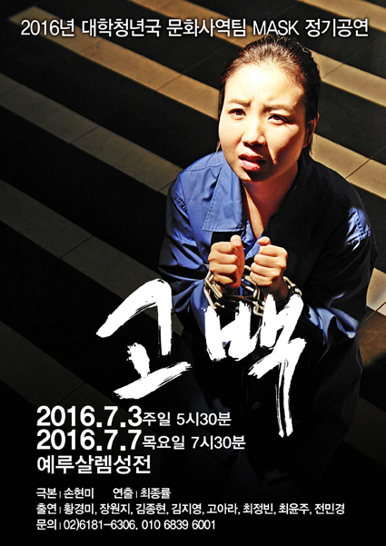 ¹®È¼±±³¿¡ ¾ÕÀå¼´Â ´ëÇÐû³â±¹ ¹®È»ç¿ªÆÀ ¸¶½ºÅ©(MASK)°¡ ¼º±Ø ¡®°í¹é¡¯À» °ø¿¬ÇÑ´Ù. 3ÀÏ ¿ÀÈÄ 5½Ã 30ºÐ, 7ÀÏ ¿ÀÈÄ 7½Ã 30ºÐ¿¡ ¿¹·ç»ì·½¼ºÀü¿¡¼ ¸·À» ¿Ã·Á ´©±¸³ª º¼ ¼ö .... ¤ÓÀ̹̳ª ±âÀÚ 2016-07-03